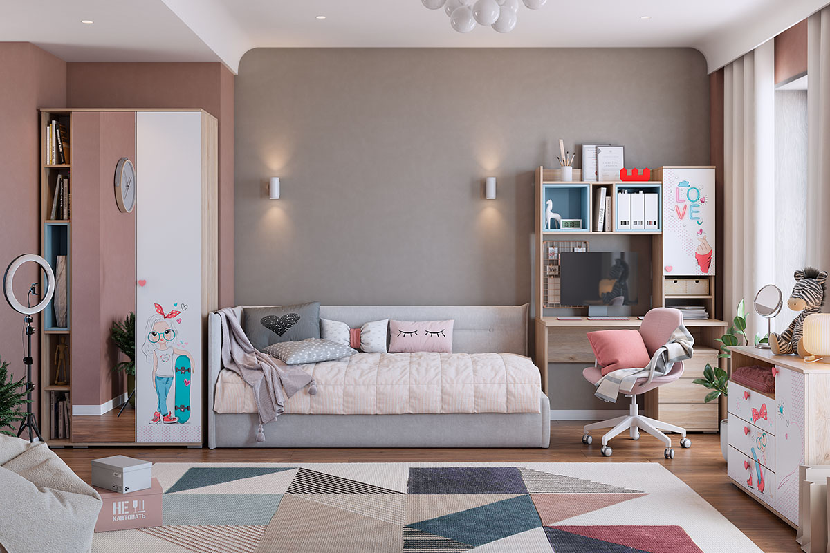 Модульная детская мебель - это стильная и яркая коллекция для девочек. Модный и стильный рисунок на фасадах и яркие ручки, придадут индивидуальность детской комнате. Принтерный рисунок устойчив к истиранию и ультрафиолету.