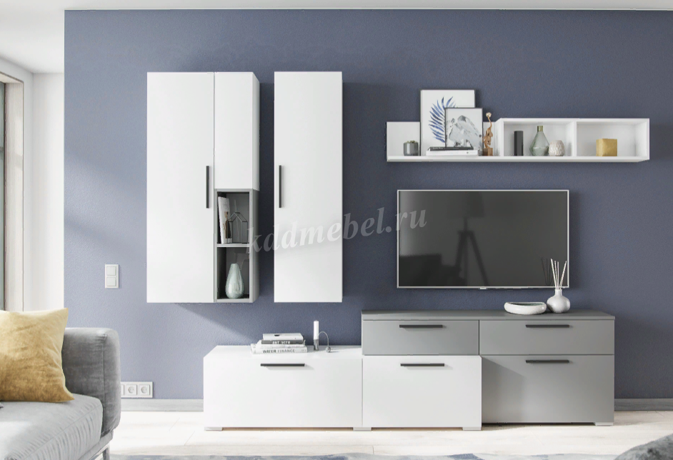 Ультрамодная и компактная гостиная Альберо станет украшением Вашего дома! Коллекция представлена навесными шкафами-пеналами, тумбами под ТВ-аппаратуру, открытыми стеллажами и навесной полкой. Благодаря разнообразию модулей Вы сможете расположить все Ваши вещи: бытовые мелочи, предметы декора, книги, технику и многое другое. Основным цветом мебели выступает белый: освежает интерьер помещения и визуально расширяет пространство. В сочетании с благородным стильным серым графитом белый цвет раскрывается по-новому.