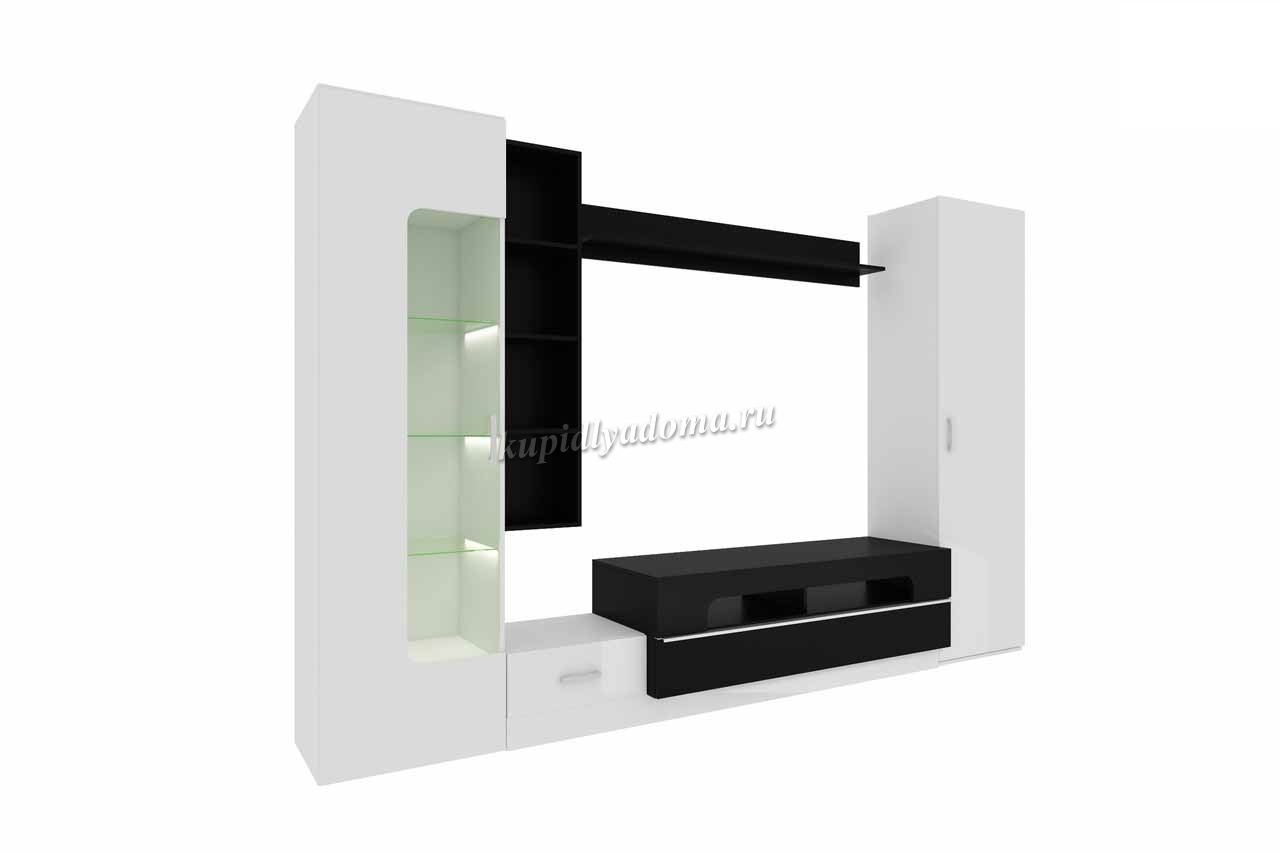 Черно-белое сочетание, впишет гостиную Лофт-20 в любой интерьер. А теплый свет подсветки в полках и нише тумбы создаст дополнительный уют.