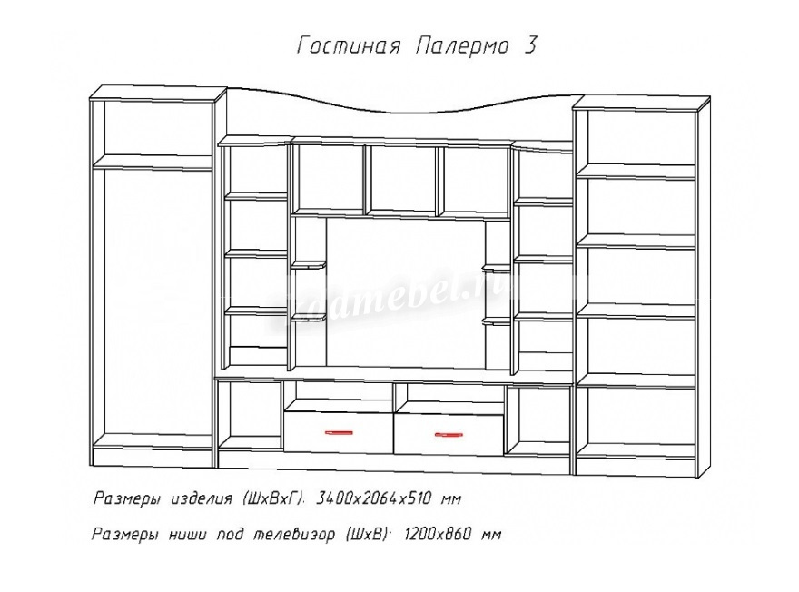 Ниша под ТВ, мм (ш х в):1232х860 мм (ниша ТВ без учета полок 890х860 мм)