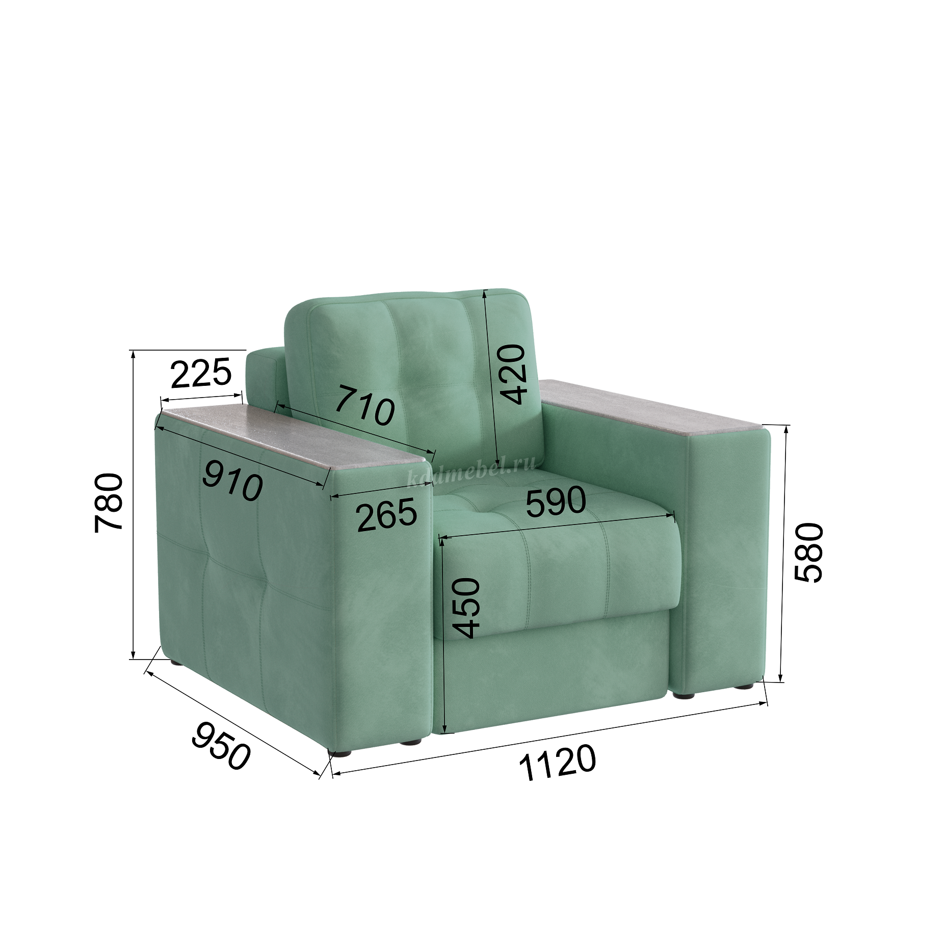 Подлокотники шириной 265 мм, обтянутые тканью и простеганные двойной отделочной декоративной строчкой.
