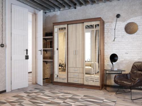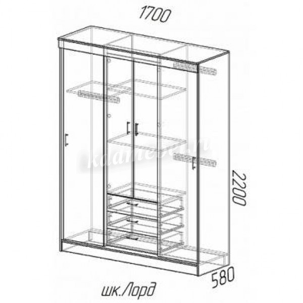Удобный и вместительный шкаф-купе ЛОРД благодаря необычному дизайну хорошо подойдет интерьеру в любом стиле. Изюминкой шкафа являются оригинальные зеркальные фасады. Шкаф отлично будет смотреться в спальне или прихожей, добавляя помещению света. Два боковых отделения шкафа предназначены для хранения одежды и комплектуются антресольной полкой и 3 штангами. Центральное отделение в нижней части оборудовано тремя вместительными ящиками, верхняя часть с распашными дверцами комплектуется полками.